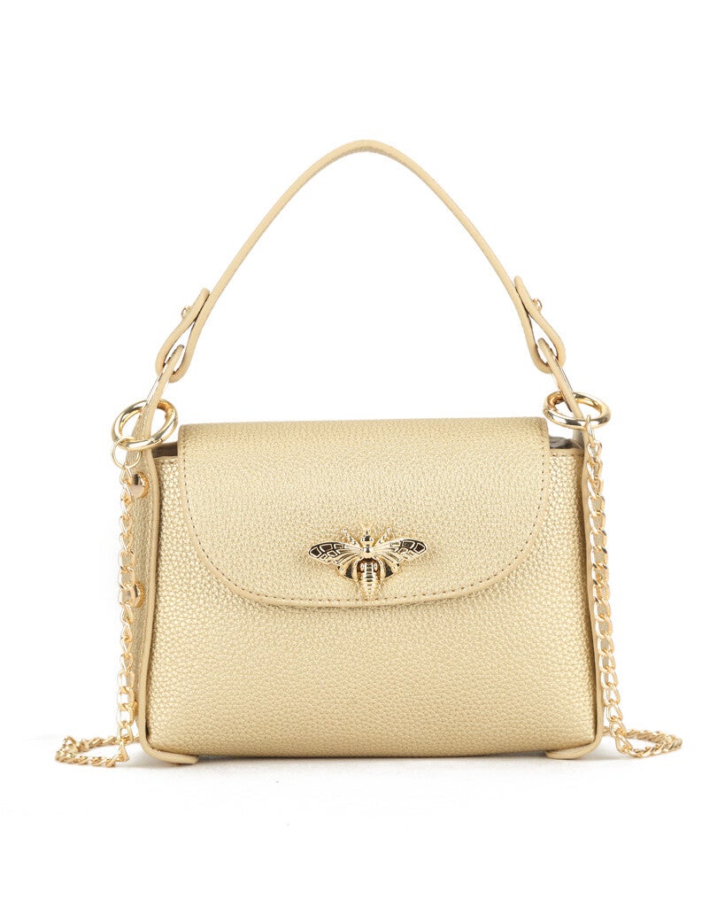 Kunstlederen schoudertas met bijen design aan de voorkant. Deze tas heeft een goudkleurige ketting als schouderband.